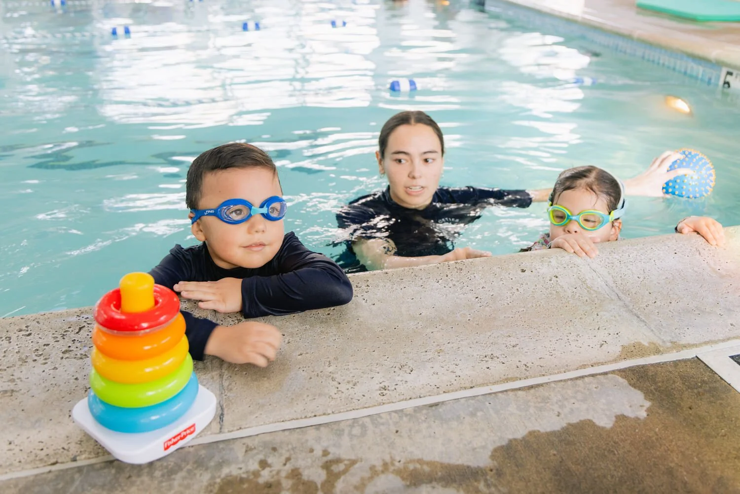Nuestra piscina se mantiene climatizada a 92 grados durante todo el año. Creemos que el agua cálida es esencial para aprovechar al máximo la experiencia de aprendizaje de natación.